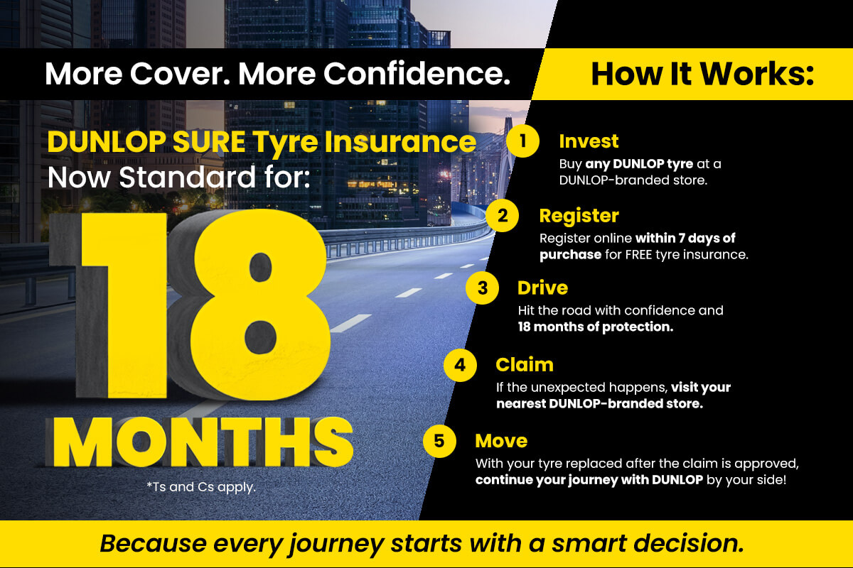 Tyre Insurance is FREE for 18 months after purchase at a Dunlop-branded dealership.